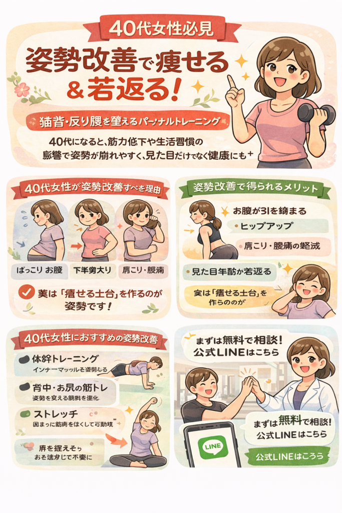 【40代女性必見】姿勢改善で痩せる&若返る|猫背・反り腰を整えるパーソナルトレーニング