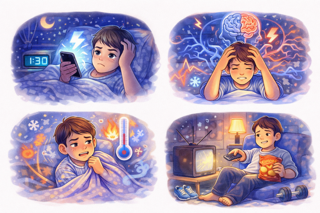 その結果、入眠が遅れ、睡眠の質が低下します。
