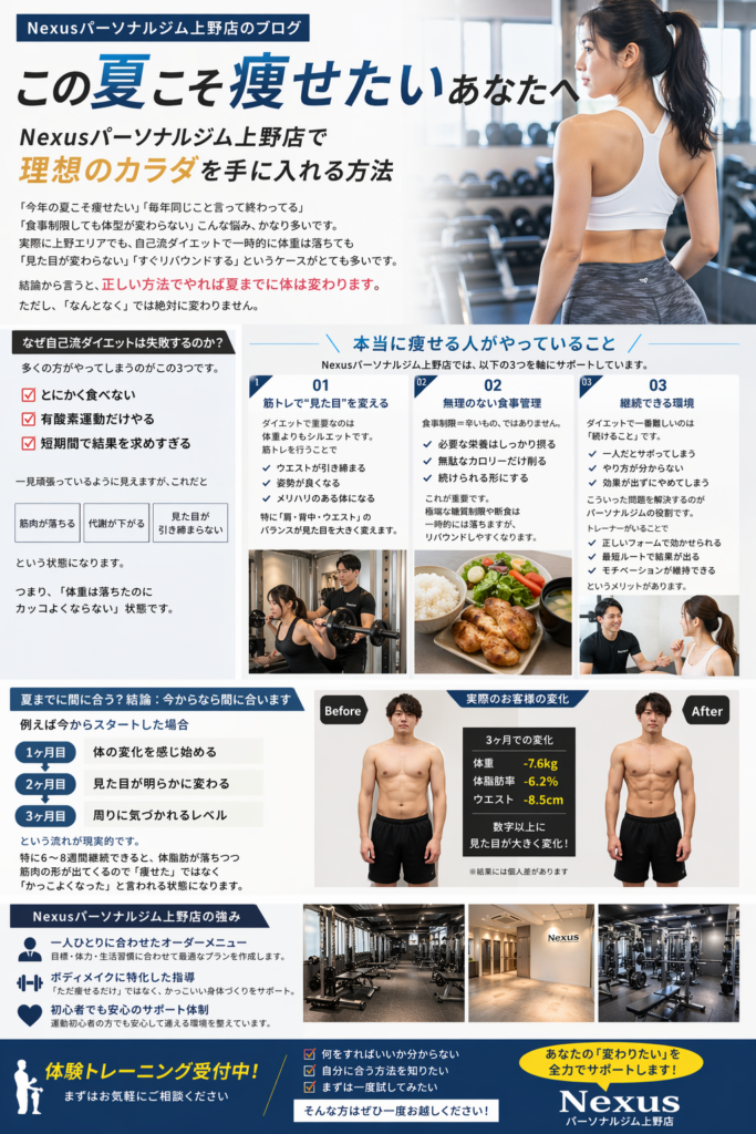 今回は、Nexusパーソナルジム上野店が考える「夏までにしっかり痩せるためのポイント」を分かりやすく解説します。