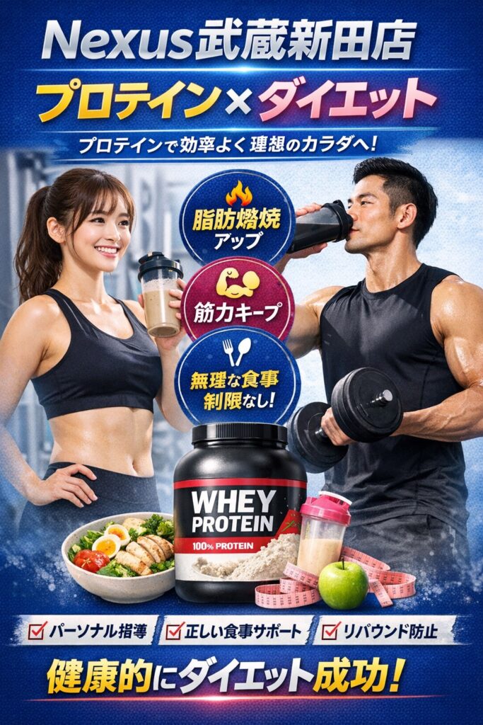 Nexus武蔵新田店では、トレーニングだけでなく、プロテインや栄養管理まで含めたトータルサポートを行っています。